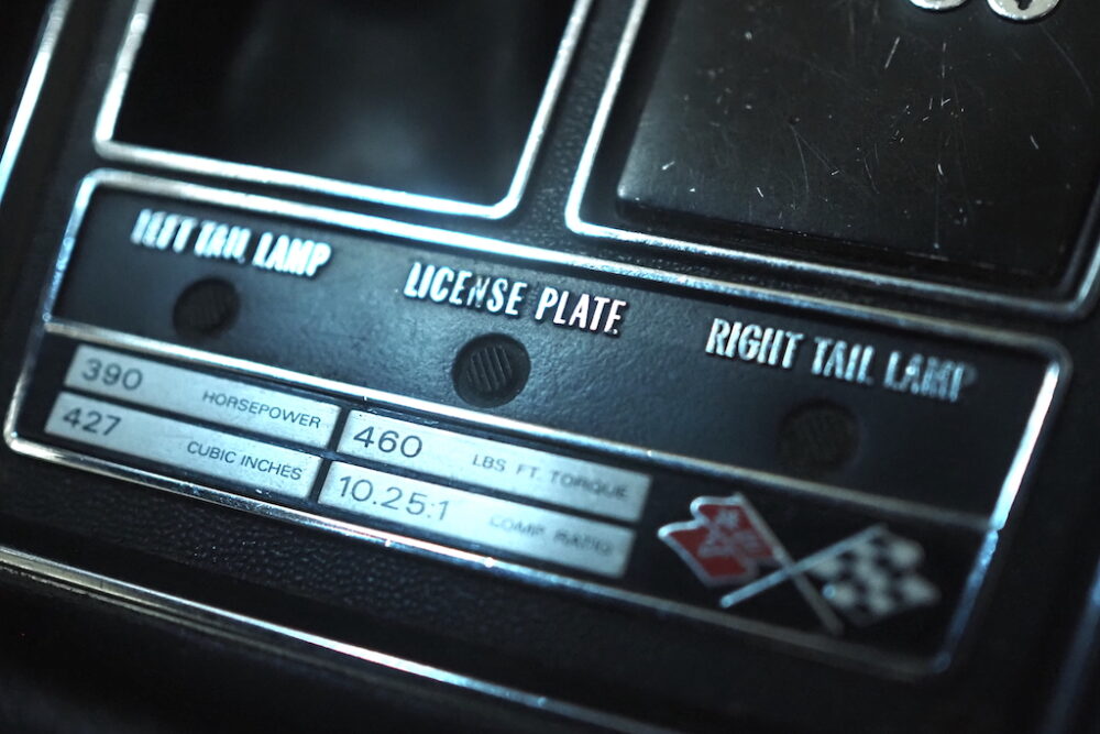 センターコンソールのシフトレバーのところにこのクルマのスペックプレートが装備される。正真正銘の390馬力の427キュービックインチエンジン搭載車だということがわかる。