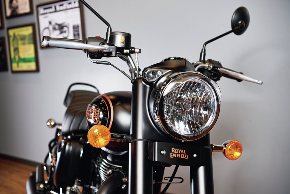 ライトとフロントフォークを覆うヘッドライトナセル。上部の左右にある「タイガーアイ」と呼ばれる小さなランプはBULLETならではの特徴だ。