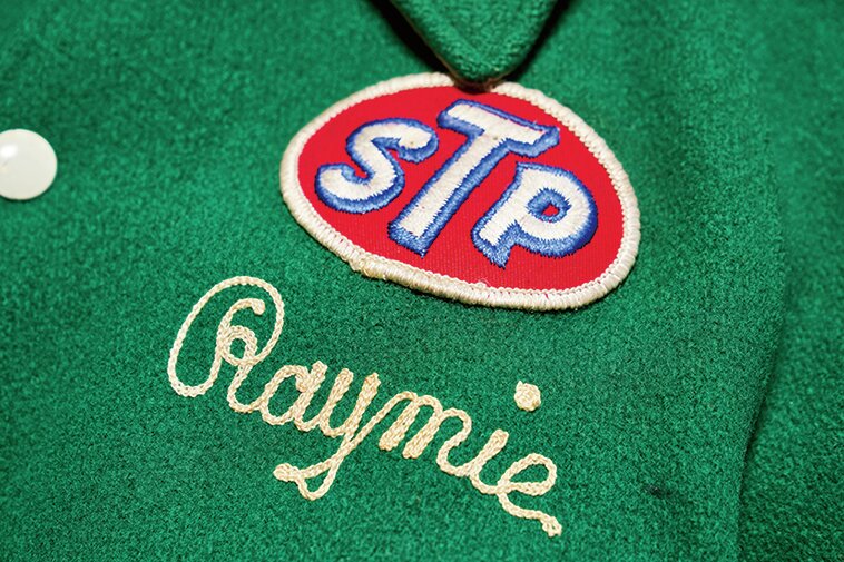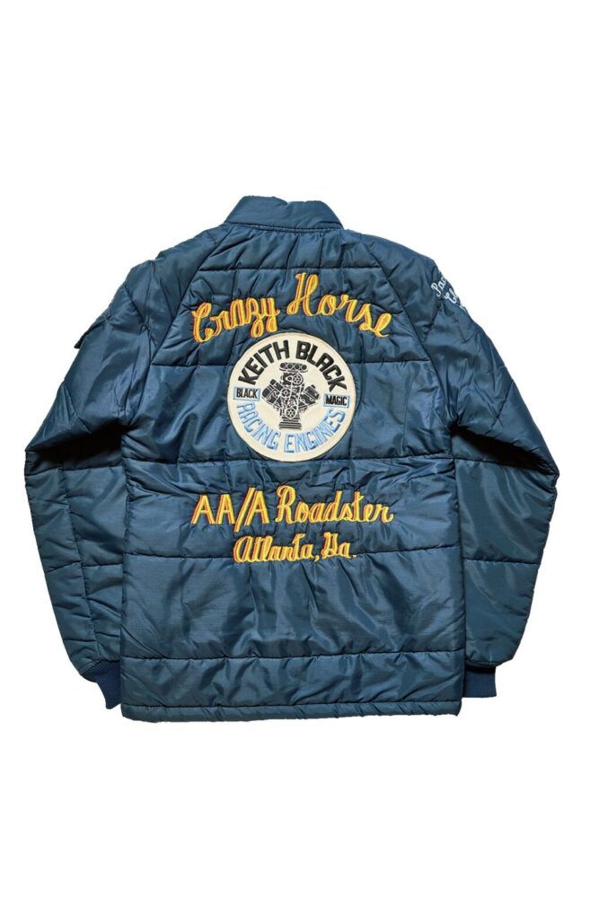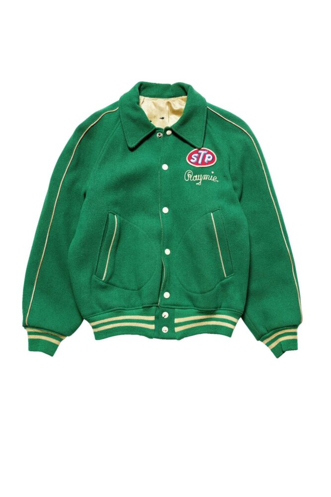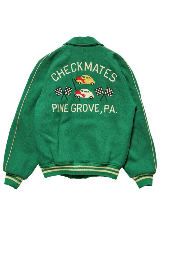 緑ベースでユニークなポケットなどジャケット自体も珍しいが、胸には「STP」、背面にはフレイムス(ファイヤーパターン)が入ったホットロッドと共にチェッカーフラッグが描かれており、恐らく「CHECK MATES」というチームのジャケットと思われる。24万8000円