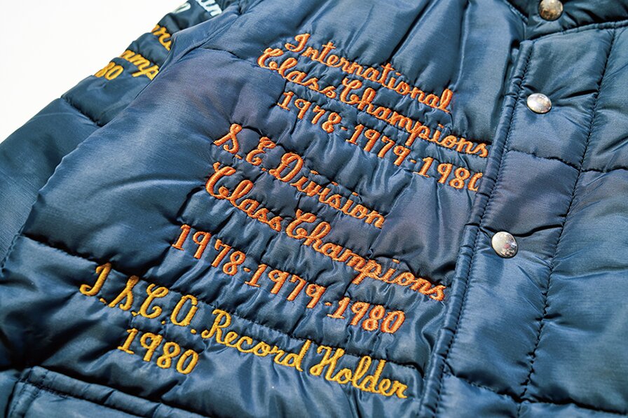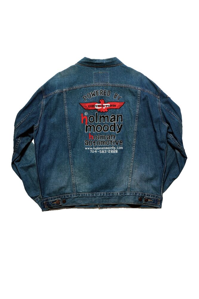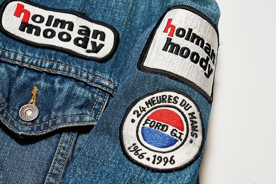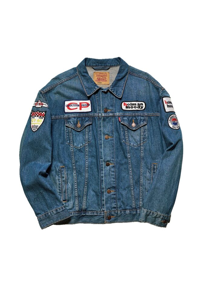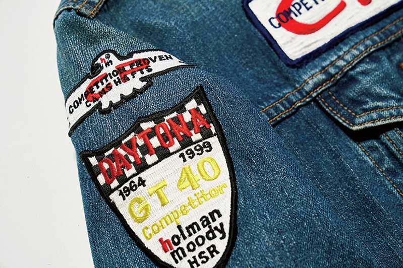 ベースは2000年前後のリーバイスの3rdモデルだが、背中はじめ各所に1965年、66年にル・マンで奥山さんも所有するGT40を優勝させた「ホルマンムーディ」のロゴをはじめ、レースに関するワッペンや刺繍があしらわれることから、オフィシャルなのかクルーなのか何らか関わりがあった人が作ったものと思われる。ASK
