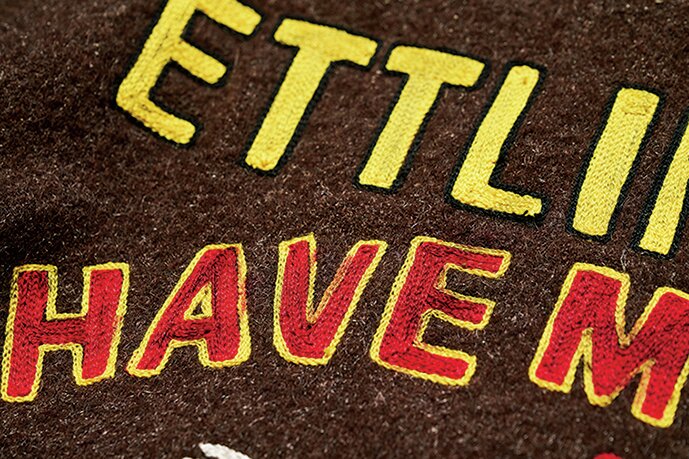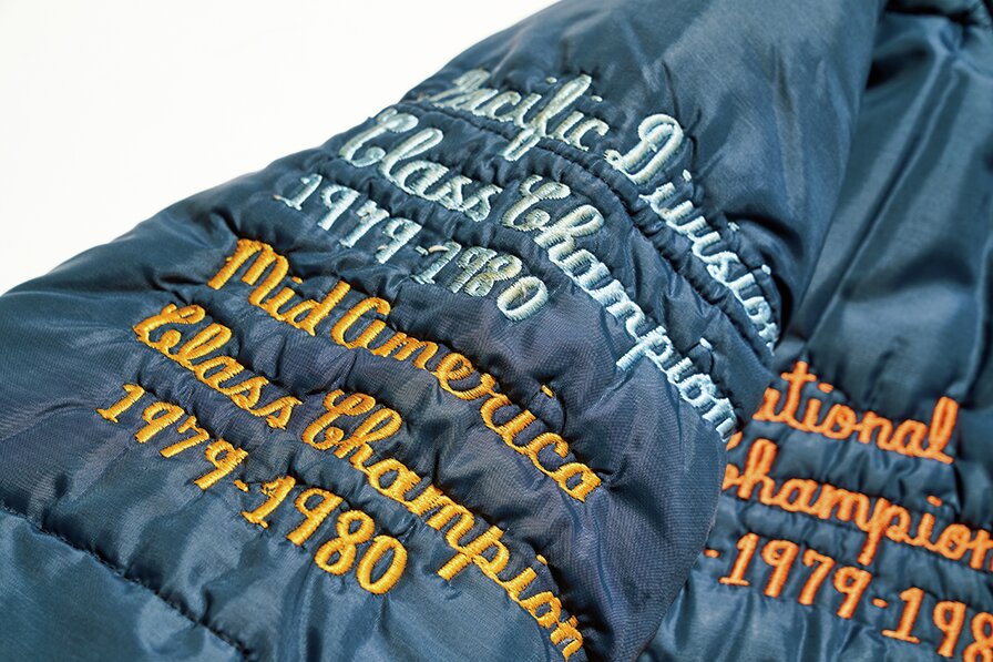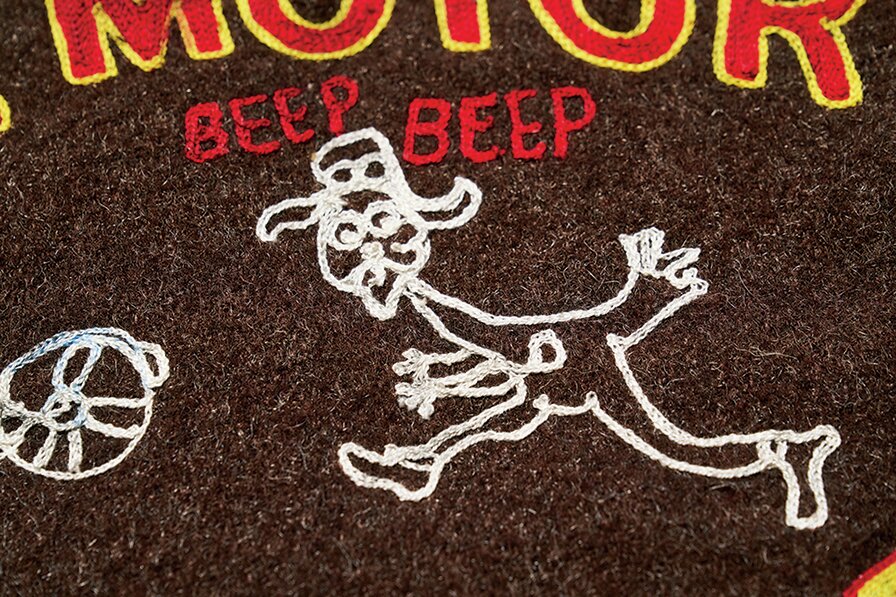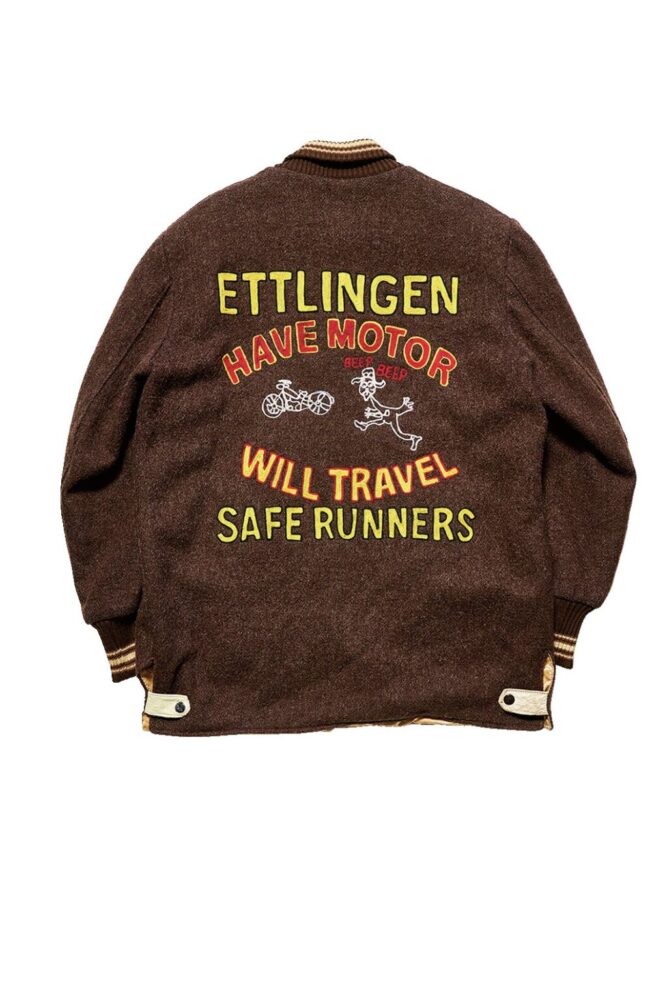 背面の刺繍からバイクのチームジャケットだと推測されるが、当時はライダースかGジャンが一般的でファラオジャケットがベースで、かつファラオジャケットにチェーン刺繍という組み合わせもレア。下手ウマなバイクとロードランナーのデザインも秀逸。39万8000円