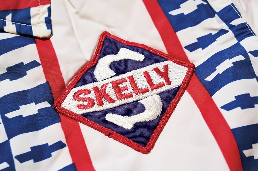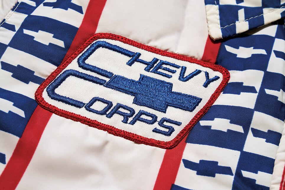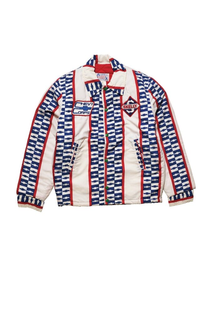 1970年代。アメリカ車メーカー、「シェビー(シボレー)」の総柄。「STP」の総柄は見かけるが「シェビー」の総柄はレア。左胸にはロゴ、右胸にはオイルメーカー「SKELLY」のワッペンが貼られることから恐らくレースクルーに配られたモノと推測される。ASK