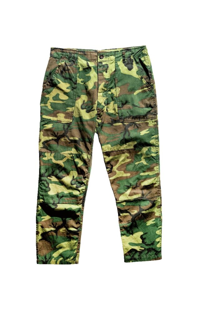 南ベトナム軍のレンジャー隊が採用したグリーンリーフカモのM-59パンツ。ワイドでもタイトでもない、ちょうどいいシルエット感が日常的に使いやすい万能アイテムだ。2万7500円