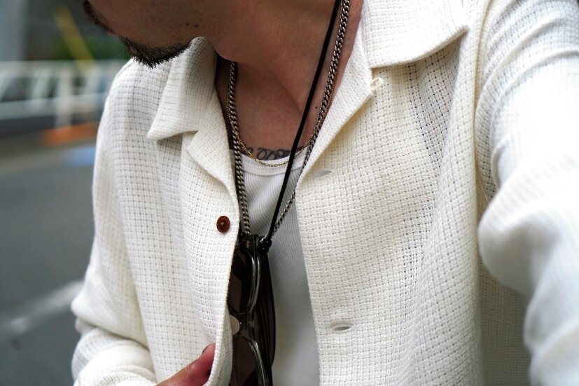 「チョッパースタイルのナックルなので、トロフィークロージングが体現する旧きよき時代のワークウエアは、ちょうどいい塩梅でマッチしてくれます。まだ穿いたばかりなので、汚れていませんが、ホワイトのワークパンツがオイルなどで味が出てくると、よりマッチしてくれるんです」