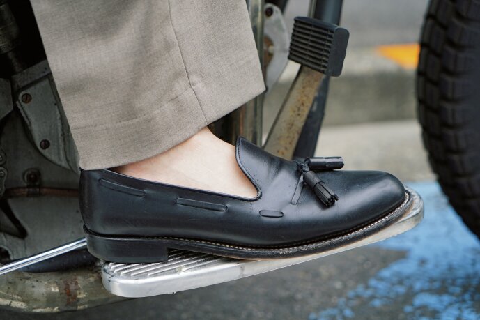 「このインディアンはハンドシフトなので、シューズに制約がなく、自由なスタイルで乗れるのが醍醐味。今日はグラッドハンドが得意とする都会的なリゾートスタイルでコーディネイト。スラックスにオープンカラーシャツを合わせ、足元はグラッドハンドとリーガルのタッセルで季節感を出しています」