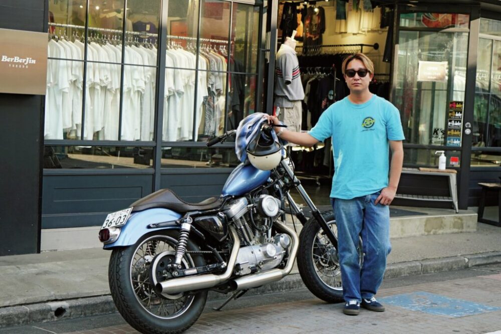 名店ベルベルジンの新店として2021年にオープンした遊歩道店。ディレクターを務める蒔田さんの愛車は、新進気鋭のヒューモンガスカスタムサイクルスでカスタムしたスポーツスターのチョッパーだ。