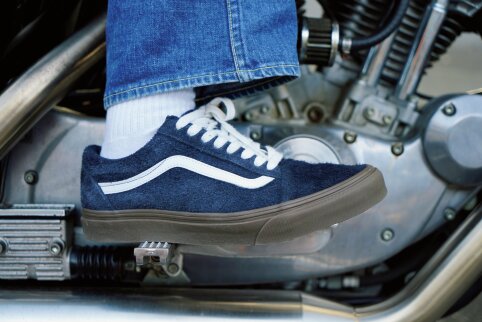 「今日はタンクのカラーリングに合わせた西海岸スタイル。このタンクはカリフォルニアで走っている’60年代のアメリカ車をイメージしています。だからTシャツにデニム、ヴァンズで乗るくらいがちょうどいいんです。コーデも西海岸らしい淡いブルーを取り入れました」