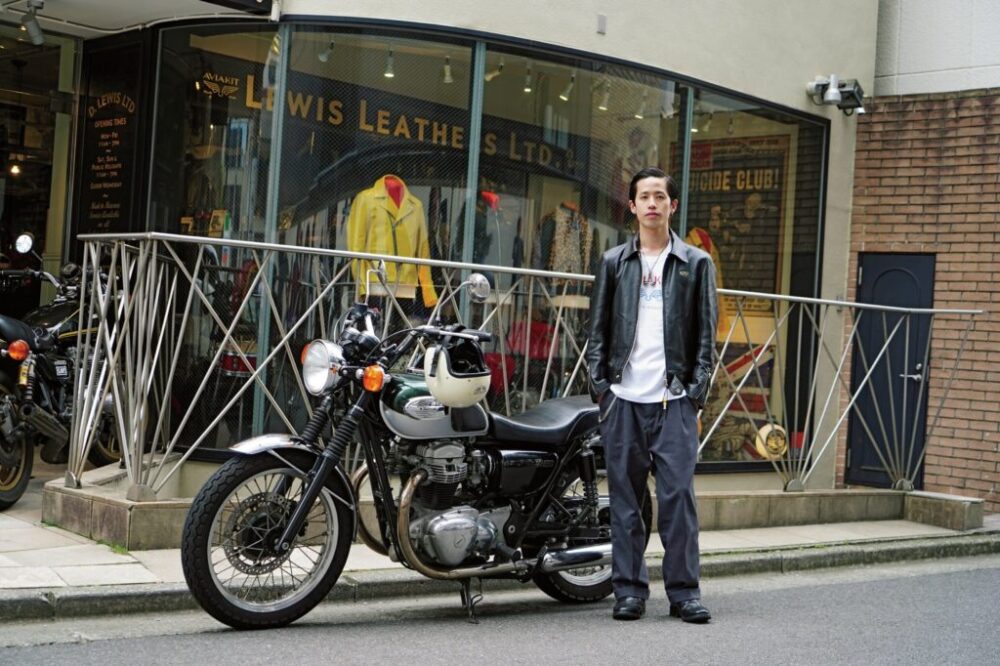 英国のモーターサイクルジャケットを象徴するブランドであるルイスレザーズ。日本のフラッグシップストアのスタッフは、英国車は言わずもがな、実は日本車に乗っている人も多い。安田さんが選んだのは、ネオクラシックバイクであるカワサキのW650だ。