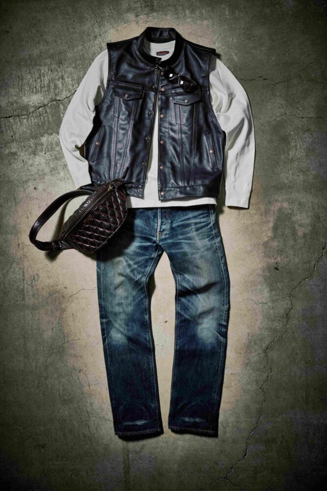 本国のアウトローMCをイメージしたハードな雰囲気が特徴的な着こなし。レザーベストはポケットが増える利便性に加え、防風性の高さからロングライドの疲労を軽減する。さらに、インナーによって印象が大きく変わり、幅広いレイヤードを楽しめるのも魅力だ。着込むほどに風合いの変化を楽しめるレザー&デニムによる質実剛健を極めるスタイルだ。