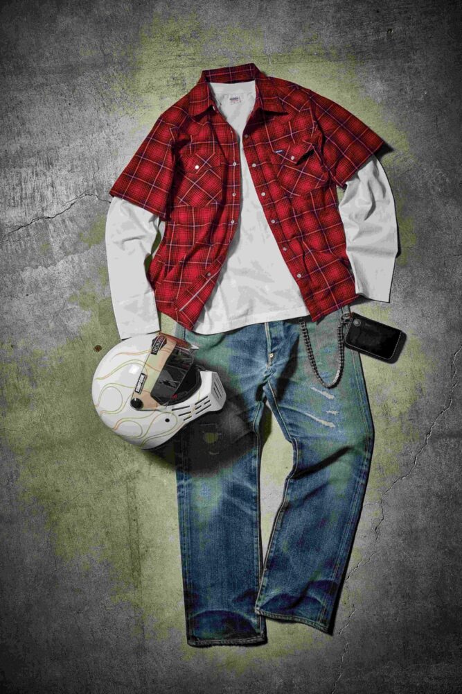 程よくレトロなデザインと力の抜けたラフな着こなしにウエストコーストのバイカーの香りが漂う。ウエスタンシャツは普遍的なデザインでありながらも、セルビッジ生地を採用するなど、素材使いに妥協を許さないアイアンハートのモノ作りの哲学が表れた1着。愛車の新旧を問わず、喧騒を颯爽と駆け抜ける都会的なバイカーにオススメしたい。