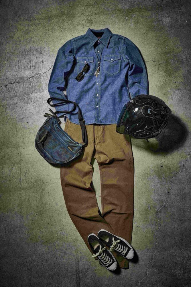 シャンブレーシャツとトラウザーを合わせたワーク色が色濃いオーセンティックな着こなしだが、どちらもバイクライドのスペックを想定した肉厚なオリジナル生地を採用する重厚さが特徴。ミリタリー、ワークの無骨さが際立つスタイルだけに、足元はローテクスニーカーでスポーティな雰囲気を演出。アクセントとなる首元の小物使いにも注目したい。