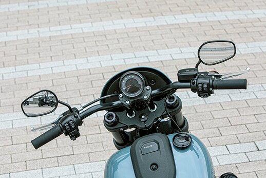 スポーティな形状のハンドルを高さのあるライザーで装着。メーターはスピードとタコが一体となったシンプルなモノ。