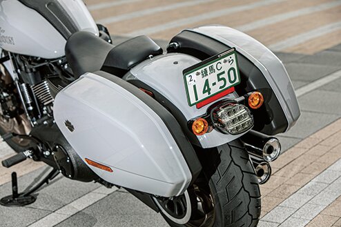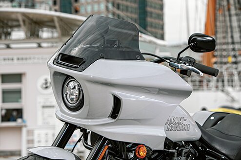 人気の高いスピードクルーザーカスタムだが、ここ数年は1983年に登場した「FXRTスポーツグライド」に装備されていた大きなフェアリングを装着することがトレンドになっている。このモデルは、そんなカスタムシーンの流行を盛り込みながら、単なる懐古主義な造形とせず、今風のデザインに昇華して現代のローライダーSにフィットさせた。防風効果の高いフェアリングに加え、着脱可能なサドルバッグを装備することで、ツアラー的な楽しみ方もできるパフォーマンスクルーザーだ。