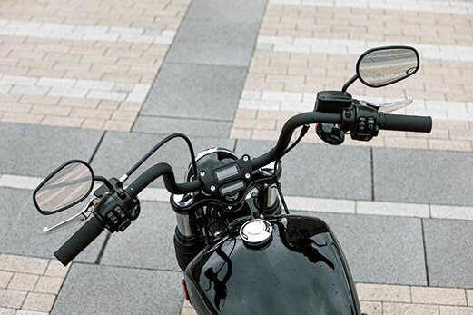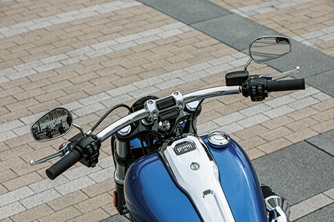 ハンドルは幅広なドラッグバー。昨年モデルよりライザーの高さが変更されたため、ポジションは意外とキツくない。