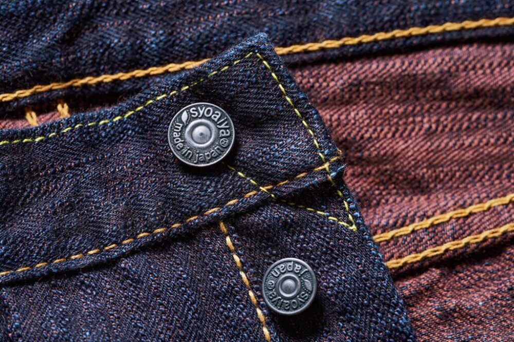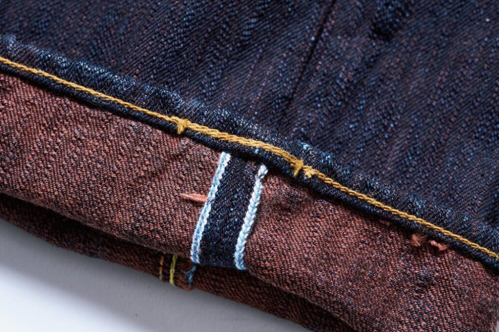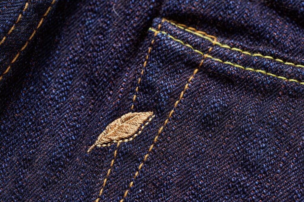 経糸は超ムラ糸をロープ染色で濃色インディゴに、緯糸は天然の柿渋から抽出した染料でブラウン/オレンジのようなカラーに染められており、一般的なブルーデニムとは一味違った絶妙なカラーのデニム生地に仕上がっている。
