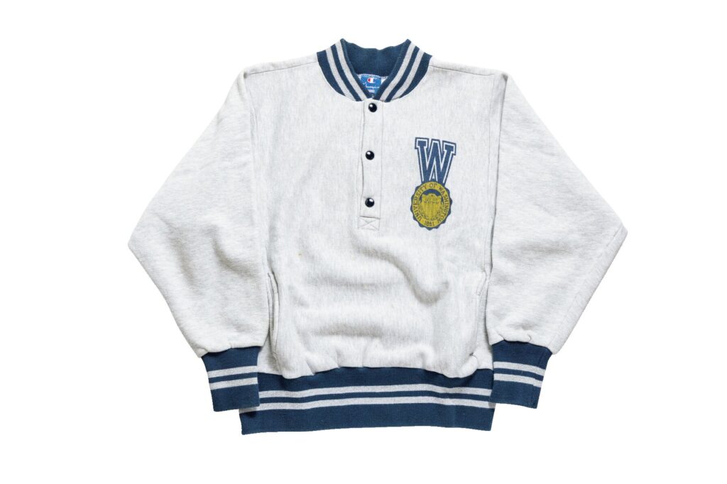 刺繍の青タグが付けられていることから1990年代製と思われるチャンピオンのスウェット。フロントが前開きでもなく、トレーナーでもなくボタン留めのプルオーバーというあまり見られないデザイン。一捻り入れたい人にオススメ。ワシントン大学のカレッジプリントが施される。5万8000円