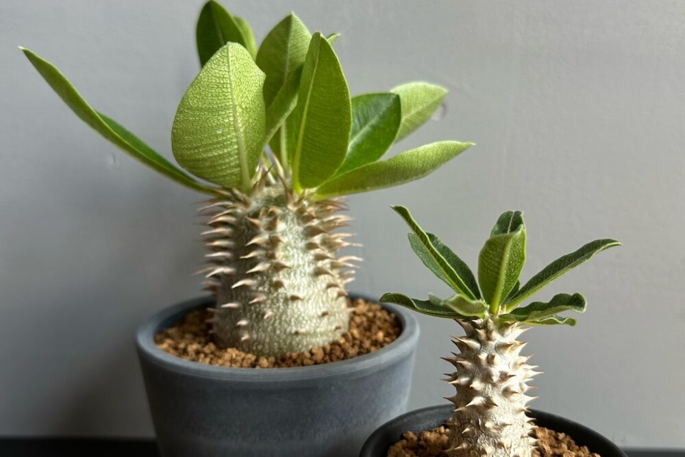 手前はパキポディウム・タッキー、奥がデンシフローラムです。デンシフローラムの縮れ葉個体から作出されたとされるタッキーですが、並べると見た目の違いもよくわかります。