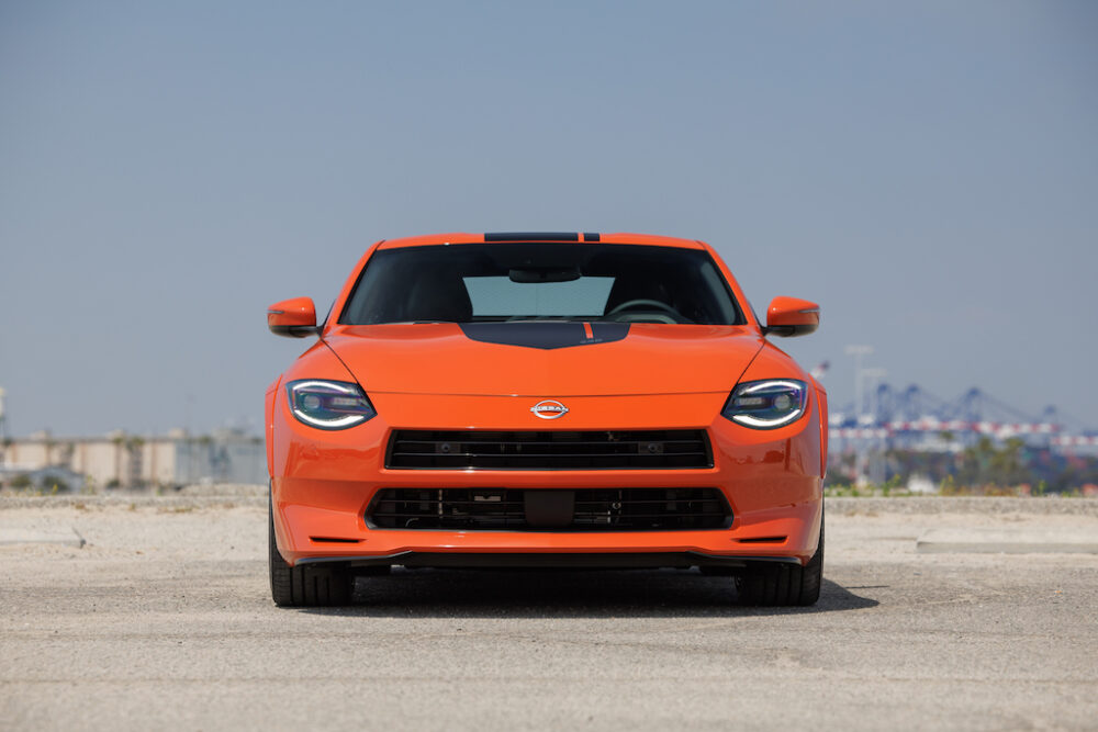 フロントグリルが上下に2分割され、前後にオーバーフェンダーを装着。これだけでぐっと初代240Zらしくなる。ボディカラーは通常モデルにはないオレンジ(日本仕様にはオレンジが標準で存在)を採用することでさらに初代Zのイメージを思わせる。