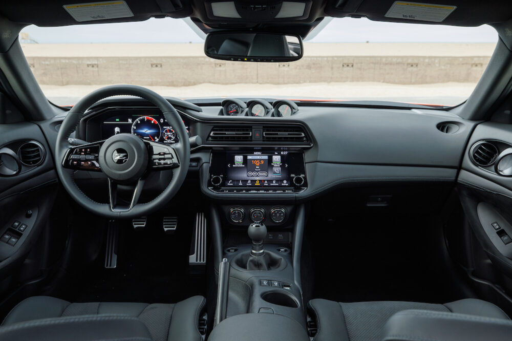 内装はブラックで統一。インパネはデジタルメーターだけど、ダッシュボード上に3連のアナログゲージがセットされるZらしいインテリアはそのまま。アメリカ仕様なので左ハンドルだ。
