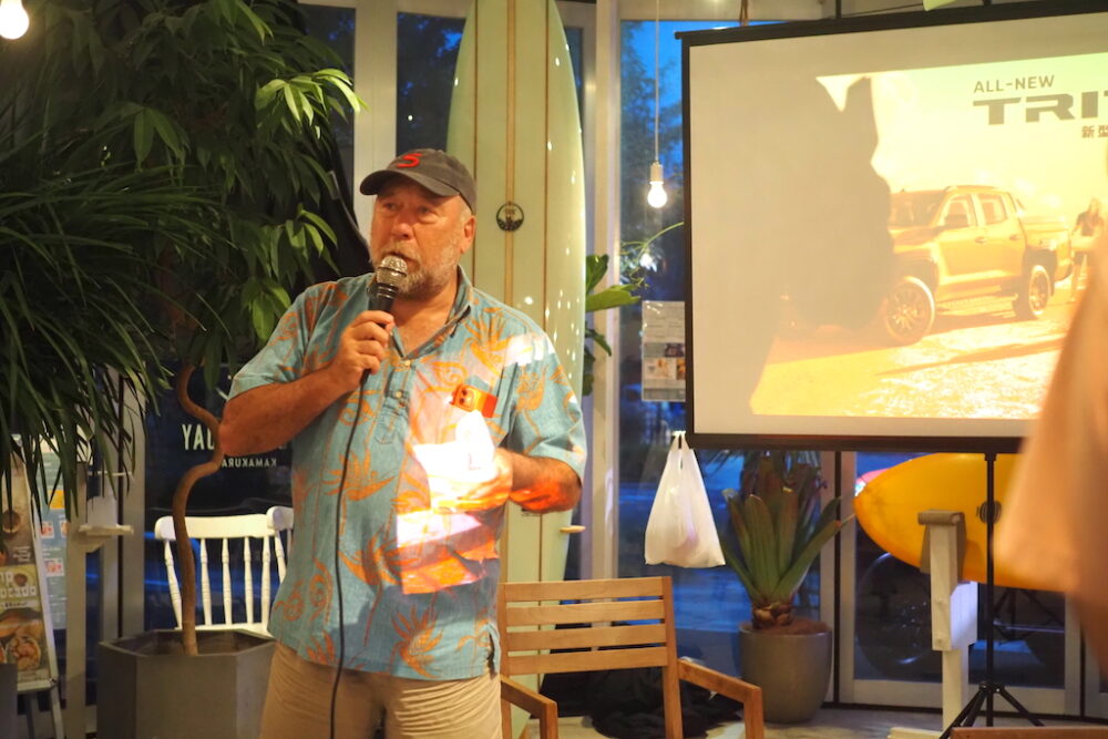 イベントの司会は自身サーファーであり、インターFMや湘南ビーチFMなどでラジオDJをするジョージ・カックル氏。小気味の良いトークで会場を沸かせる。