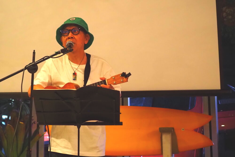 ウクレレ奏者のペケロ山内氏のライブで会場はハワイのビーチサイドの雰囲気に。多くのサーファーたちがその心地良いリズムに酔いしれ、自然とお酒も進む。