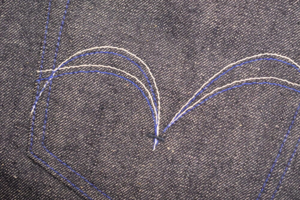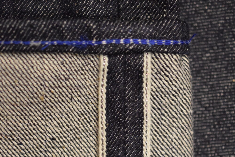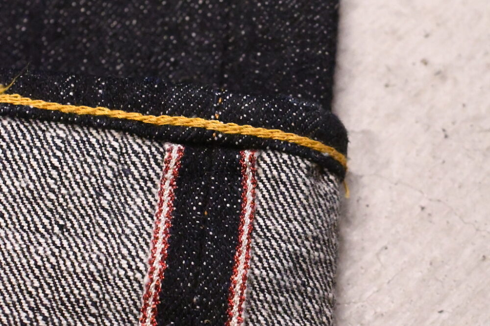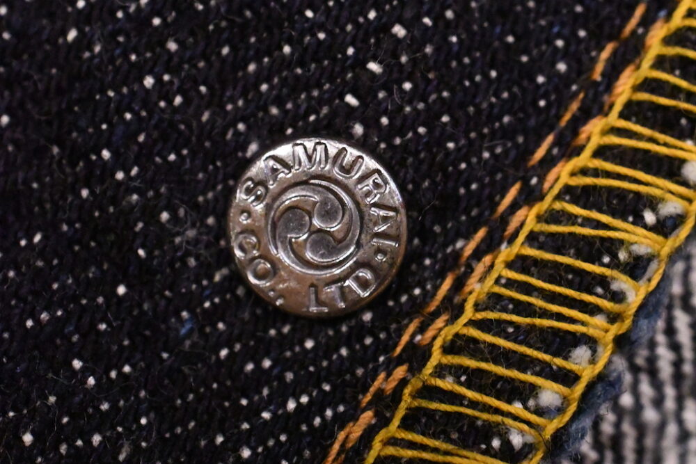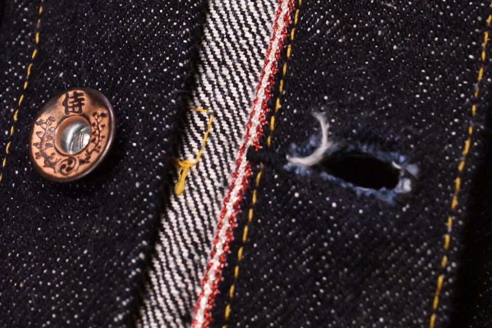サムライが別注している太く激しいムラの糸は、そもそも限られた力織機でしか織ることができないが、ザラザラとしたハードな質感を生み出すため、更に特別な調整を加えた織機でじっくりと時間をかけて織り上げている。セルビッジは端に赤ラメ糸、中心に銀ラメ糸を使ったインパクトの強い耳も特徴になっている。
