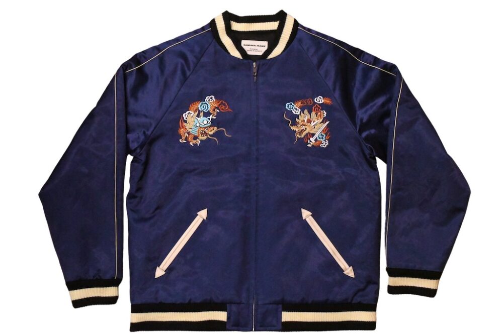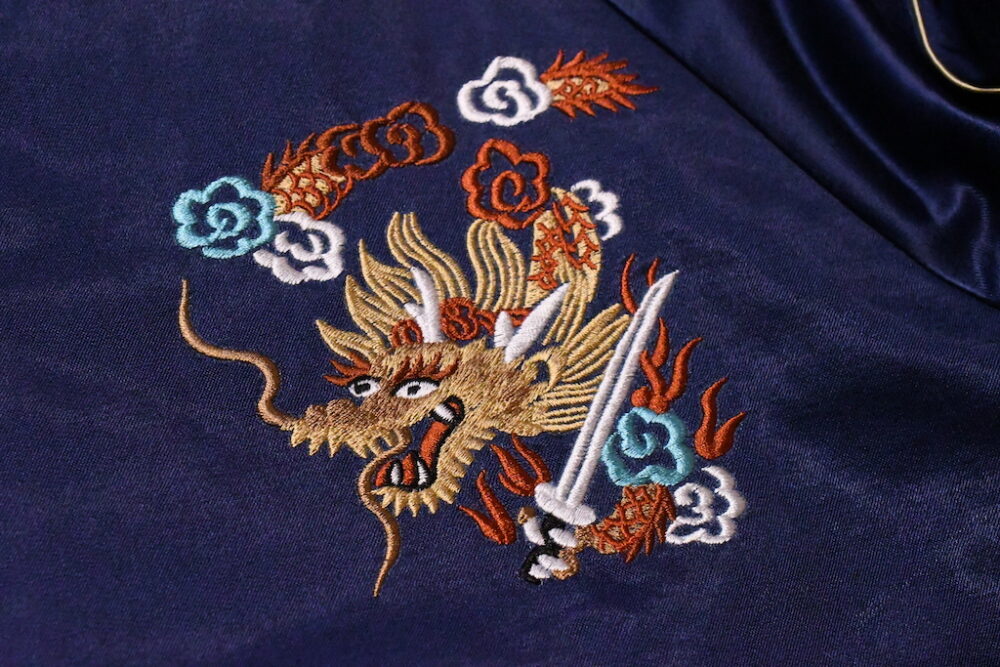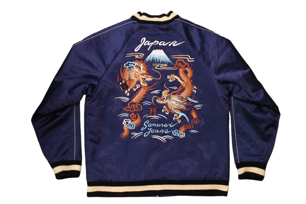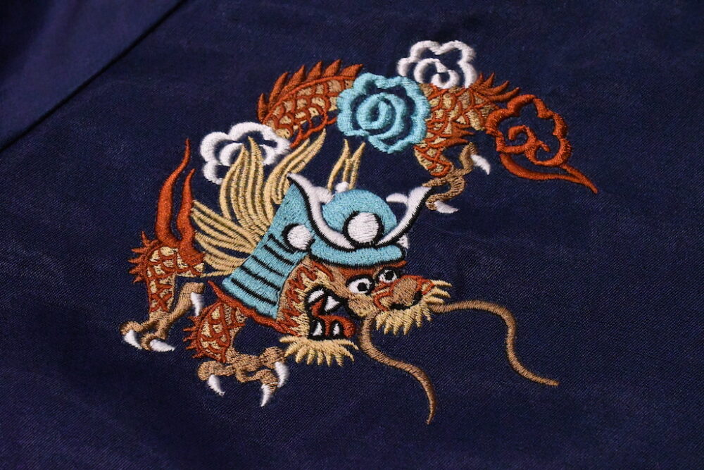 裏は黒のサテン地を使用し、薄めの中綿を入れている。龍・富士山・鳥居などスカジャンらしいモチーフにしながらも、龍に兜や刀・軍配を持たせたサムライらしいデザイン。刺繡は手振り刺繡から型を起こしており、雰囲気のある仕上がりになっている。リブも別注で編みたてたものを採用するなど作り込みはさすが。