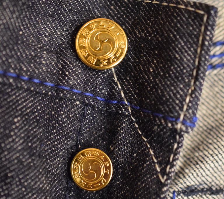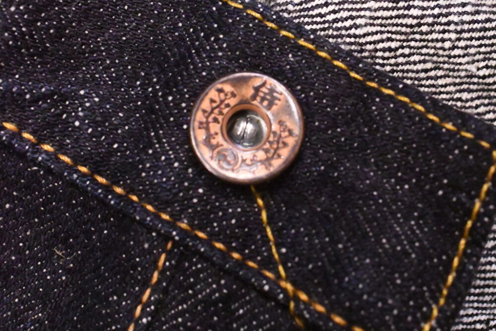 ボタンは、日本古来より武具や装飾品などに用いられてきた、使い込まれた煮色(にいろ)仕上げを行った赤銅(しゃくどう・金属)の色味を目指し、新たに作成した鉄製松ノ木ボタン。使い込むうちに光沢が落ち着き、適度に擦れて、ボタンの変化も楽しめる。