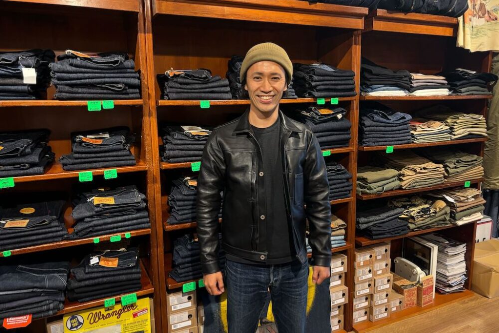 オーナーの陽平さん。サイズ感や合わせるアイテムのチョイスは勉強になる。ショップとしても力を入れているデニムコーナーをバックに。YouTubeでの活動も注目したい。