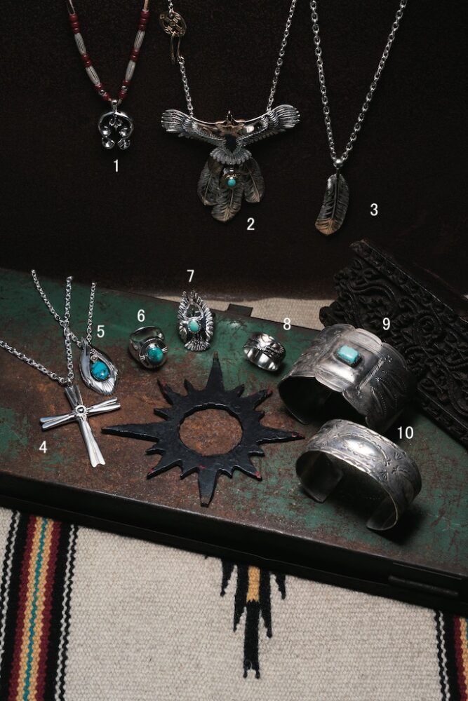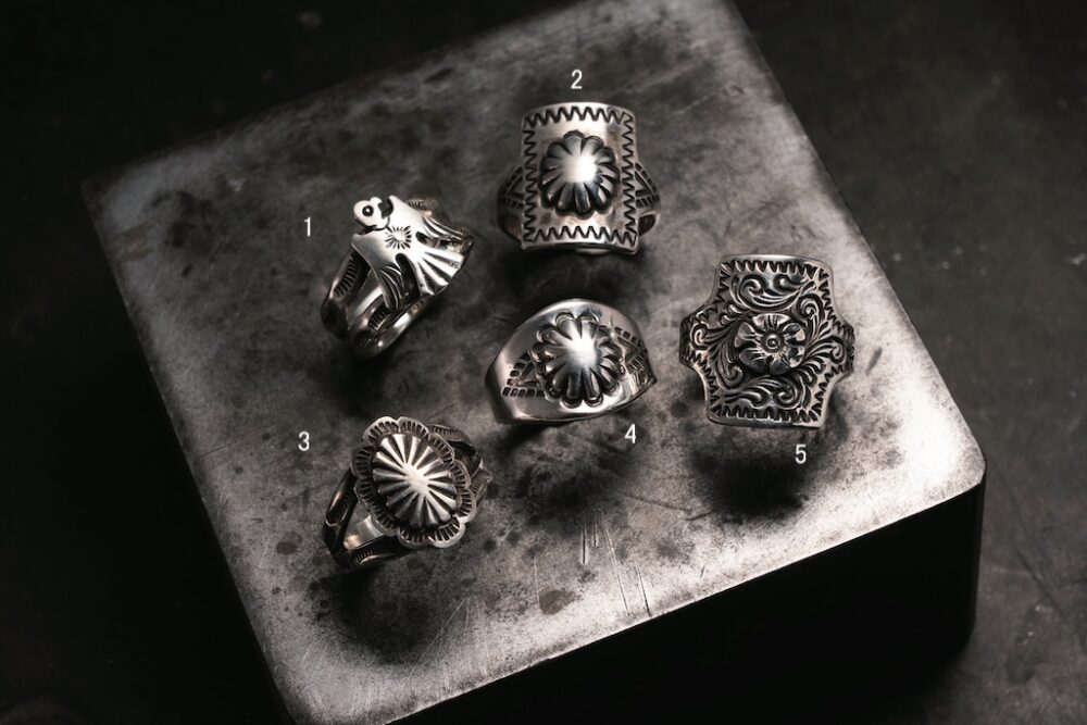 サンダーバードや花弁コンチョなど、ネイティブアメリカンの伝統デザインを色濃く映し出したリング。