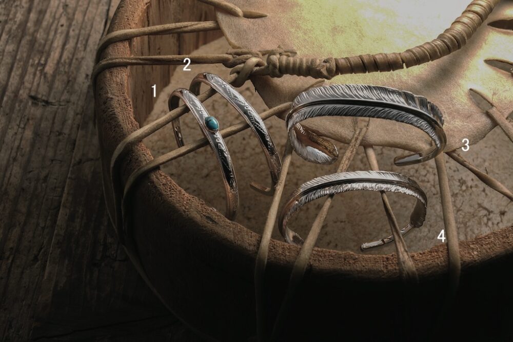唐草入り4.9㎜甲丸ブレスは鮮やかなターコイズ入りと無しの2パターン。得意とするフェザーバングルも幅違いで展開。