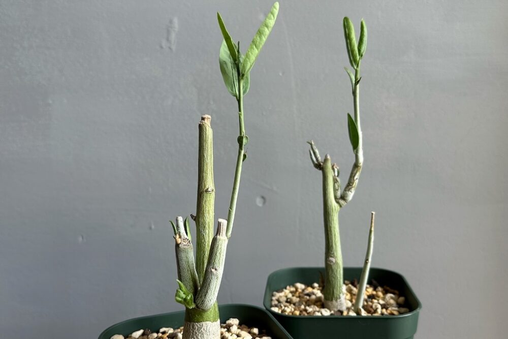 じっくりと長い年数を掛けて育てることで、挿し木でも株元から少しずつ太ってきます。もちろん現地球のような巨大な塊茎を作ることはできませんが、アデニア・ペチュエリーはそもそもの成長が非常に遅い植物です。