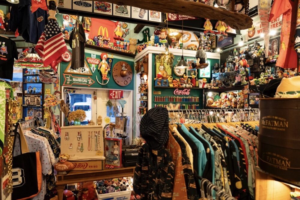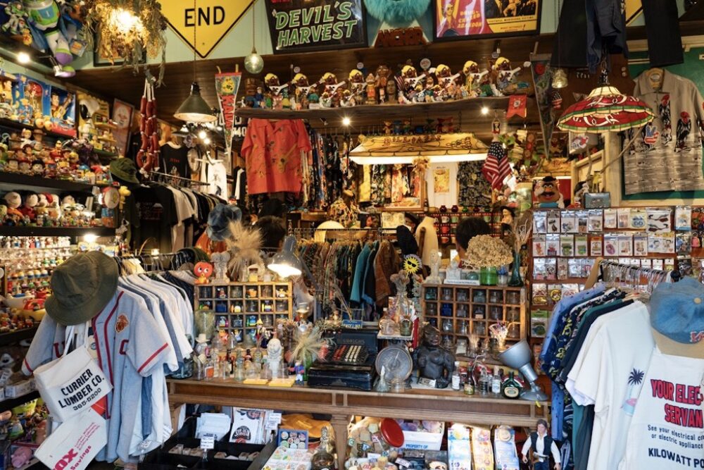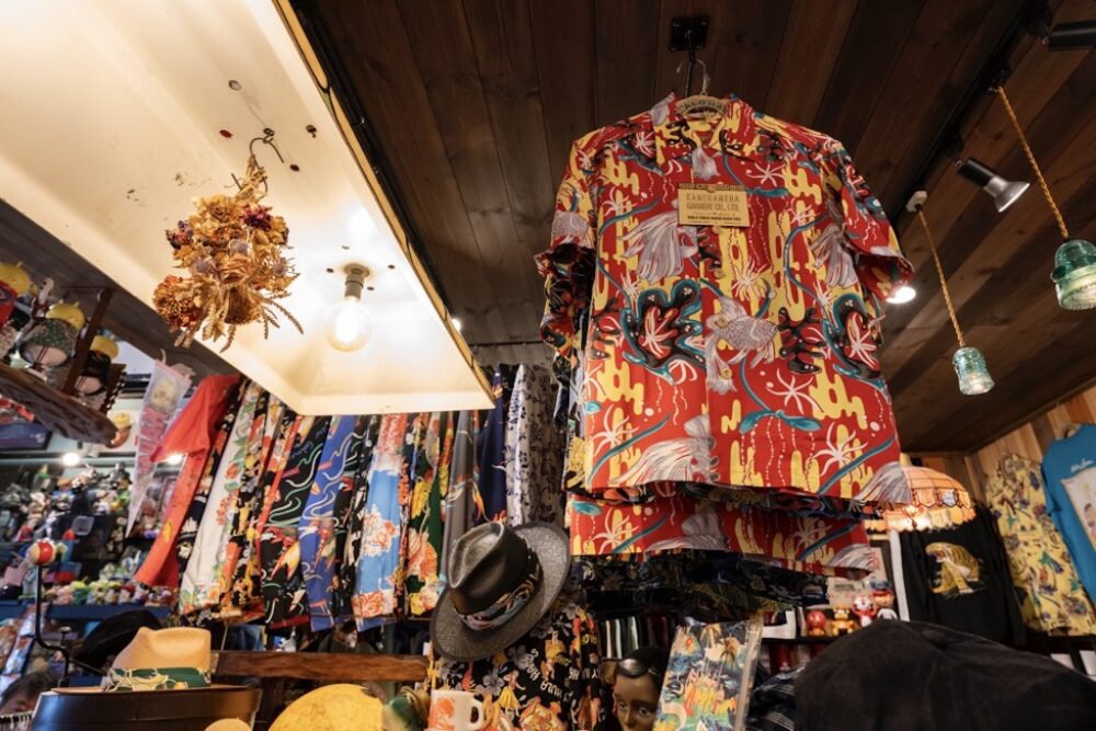 所狭しと並ぶ大量のアメリカン雑貨とサンサーフのアロハシャツ。