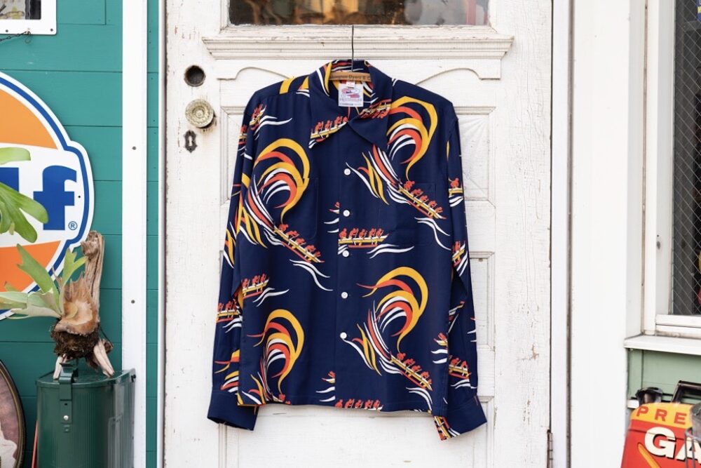 オリジナルを手掛けたマリヒニ・スポーツウェア社は1952年に設立された老舗で、オーナーのレイモンド・ササキは絵心豊かで、独自のアイデアをデザイナーに伝えて作品を生み出していた。戦時中もガレージでプリント生地を製作しシアーズなどの大手デパートの需要に応え、アロハシャツの発展に貢献した。[SS39272/3万800円]
