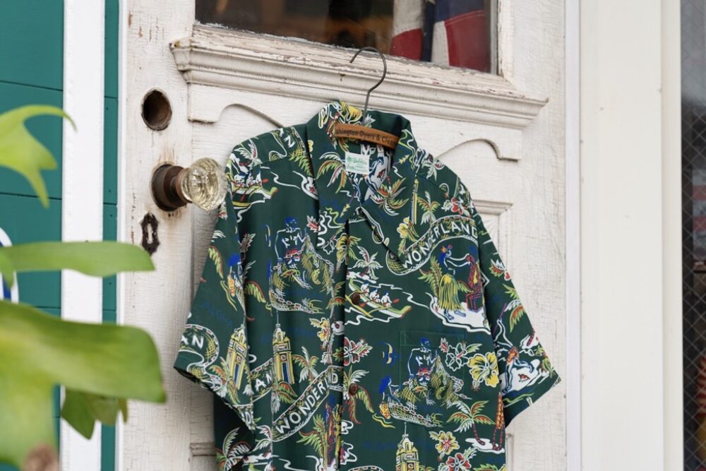ヴィンテージアロハシャツにおいて、数多く製作されたチャプスイ柄。その中でも特にインパクトが強く、優れたデザインとして有名なのがハワイアン・ワンダーランド。コレクターからの人気も高く実名での復刻は2度目となる。フラガール、アロハタワー、カメハメハ大王像、ハワイアンクレストなどの人気モチーフに加え、絵柄の中心を流れるバナー(横断幕)には「HAWAIIAN WONDERLAND」の文字が大胆に描かれている。
