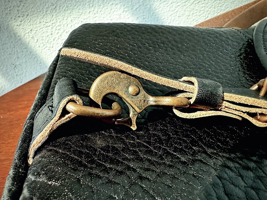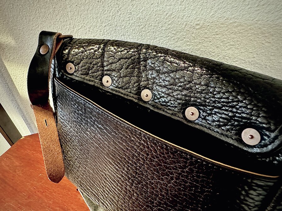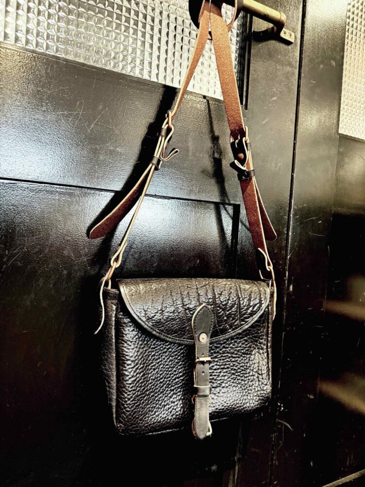 このバッグも、初めて大阪のKIGOのアトリエに取材に行った時、3歳児のように我慢が利かなくなった品。シボの荒々しさとは裏腹に、ソフトな仕上がりのレザー。そして、見たことのない光沢感。あ、あ、もうダメ〜って感じ。