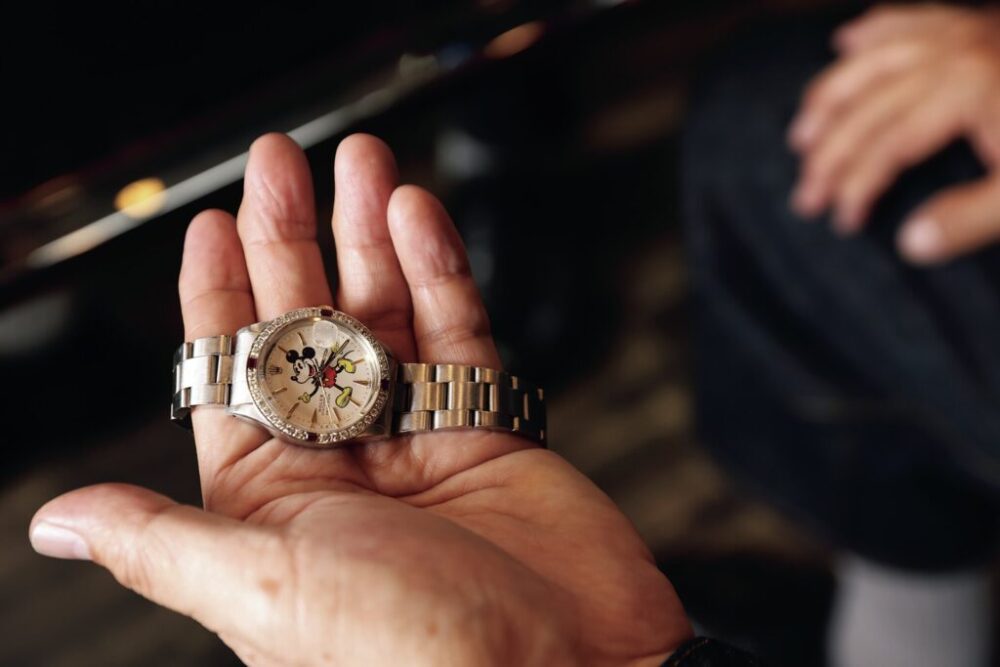 「Gジャンて手口ぴったりで狭いやろ。デカいダイバーズウォッチ風時計やと、引っかかるし、手口閉められへんがな。小ぶりな古臭い時計の方が、バランスもええやんけ。革ベルトもコーディネイトのひとつやし。ミッキーの時計は、ウケ狙い。祇園やら北新地行ったらべっぴんさんにウケまっせー。右手にはめる時計はあきまへんな。見ることあらへんわ。時計は時間を見る道具ではなくブレスレットでんな」