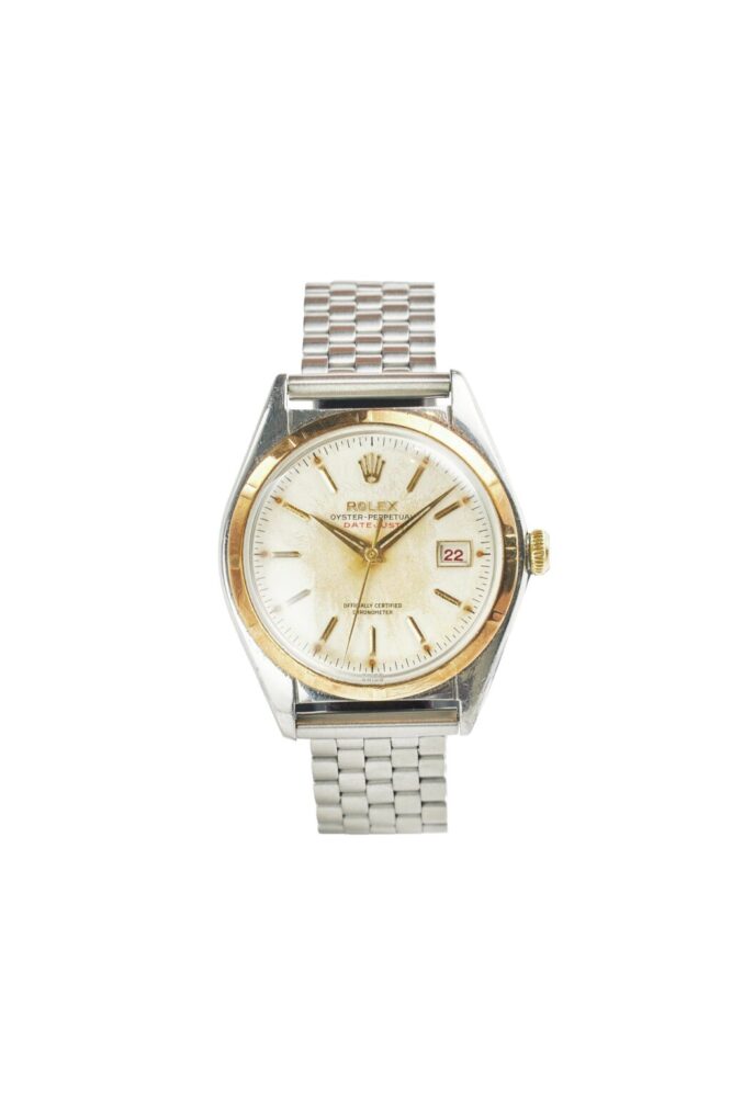 1945年にリリースされたロレックスの名作であるデイトジャストの初期モデルで、通称ビッグバブルと呼ばれる36ミリのオイスターケース。この年代ならではの赤黒カレンダーや、エレガントなエンジンターンドベゼル、立体的なインデックスなども魅力。ベルトはプライベートアイズのオリジナルを装着している。85万8000円