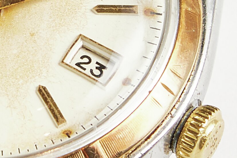 この年代は夜光にラジウムを使っているためダイヤルが焼けやすく、アンティークらしい雰囲気。エンジンターンドベゼルも◎