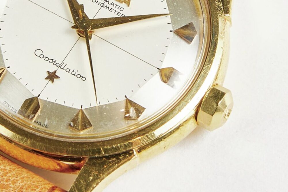 オメガの名作であるコンステレーションの18金イエローゴールドケースで、なんとノンポリッシュのミントコンディション。ハート型インデックスにドルフィンハンドを組み合わせた人気のパイパンダイヤルである。88万円