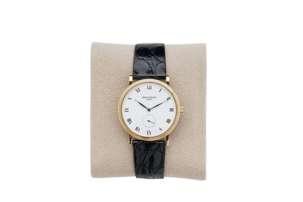 ’90年代のパテックフィリップを象徴するモデルのひとつであるRef.3919。パリの石畳をモチーフとしたクル・ド・パリと呼ばれる模様装飾が施されたベゼルに、純白のポーセリンダイヤルは、まさにドレスの最高峰。217万8000円