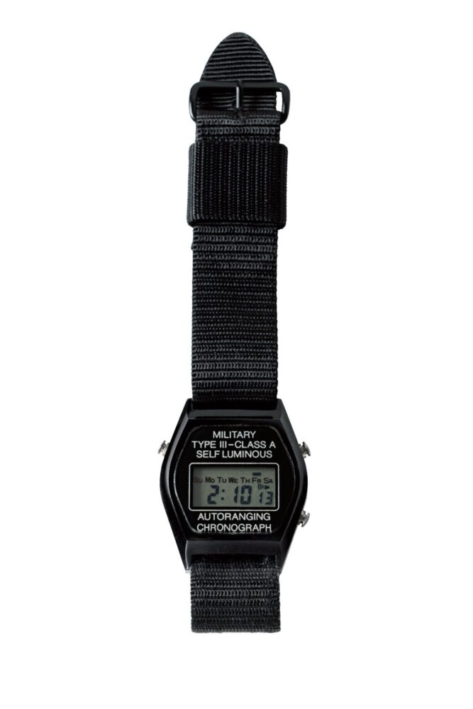 1980年~’83年まで米空軍に納入されたクオーツのデジタルクロノグラフ「TYPE Ⅲ-CLASS A」。コントラクターはストッカー&イエールで総製造数は5583個。アルミボディにブラックの焼付塗装が施されている。ストップウォッチ機能、アラーム機能を装備。ナイロンベルトは飛行服の上からでも装着できるようロングタイプ。ASK