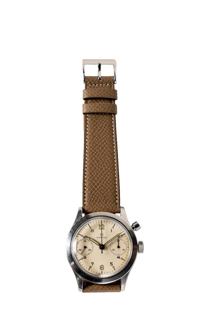オメガはカナダ空軍に1960年と1962年にクロノグラフを納入していた。このモデルはレマニアのキャリバー2220をベースにハック機能を追加したカナダ軍仕様。文字盤は梨地のホワイトダイアルで、ほんのり焼けた経年の風合いが魅力だ。ASK