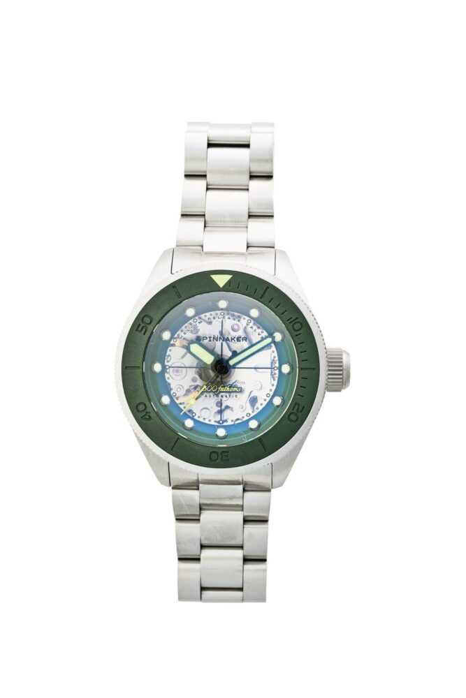 海のスポーツに関わる腕時計を作るイタリアのブランド。スーパードーム型のサファイアクリスタルレンズを採用。スケルトン文字盤の先には自動巻ムーブメントNH70を搭載。7万7000円(ウエニ貿易 TEL03-5815-3277 https://www.spinnaker-watches.jp)
