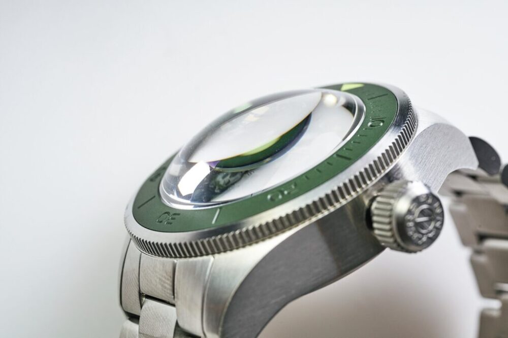 海の最深部に挑む潜水艇のような風貌。スーパードーム型スクラッチ レジスタント シェイプ サファイアレンズを搭載している。