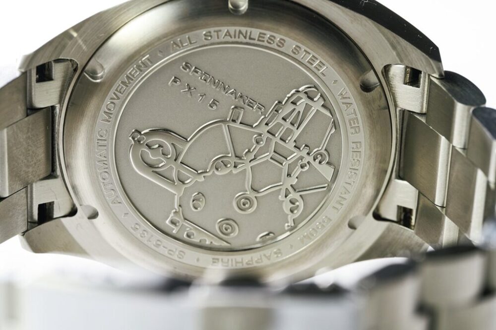 裏蓋には潜水艇をイメージした凸型刻印が立体感を出している。細部まで妥協のないつくりを感じる。ケースは45㎜