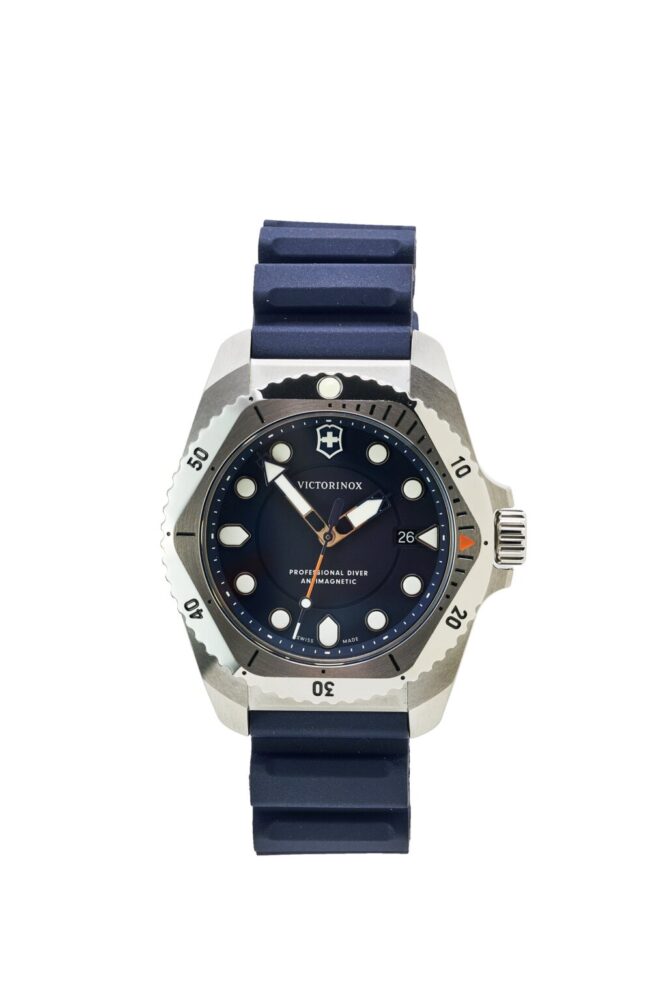 ケースのカットが美しいデザイン。ISO 6425認定のダイバーズウォッチとして300mの防水テストをクリアし、砂や泥、衝撃にも動じない強さも魅力だ。スイス製。12万1000円(ビクトリノックス ジャパン TEL03-3796-0951 https://www.victorinox.com/ja-JP/)
