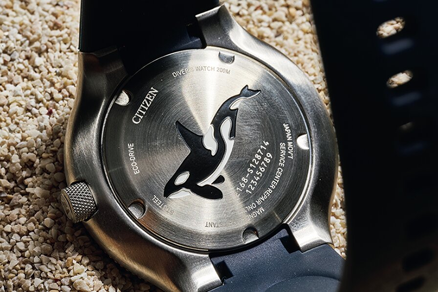 オルカ(シャチ)をモチーフにしたデザインしたモデル。流線型のケースラインやふっくらとした形状の時分針、文字盤など随所にオルカのシルエットを取り入れており、さらにバンドはオルカが水面から上がったときの背中をイメージしている。手元で常に海を感じられるほっこりデザインが愛らしい。6万6000円(シチズンお客様時計相談室 TEL0120-78-4807 https://citizen.jp)