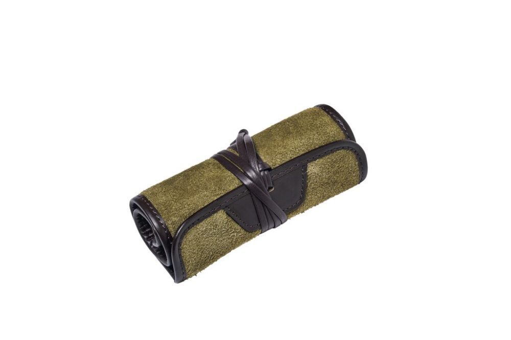 ペンケースのようなロールタイプの収納ケース。牛ベロアを使用し、経年変化も期待できる。自宅ではもちろんだが、旅にも連れて行きたいケースだ。 W33×H14㎝。2万3200円(KUGIRI TEL090-9677-4421 https://kugiri.com)