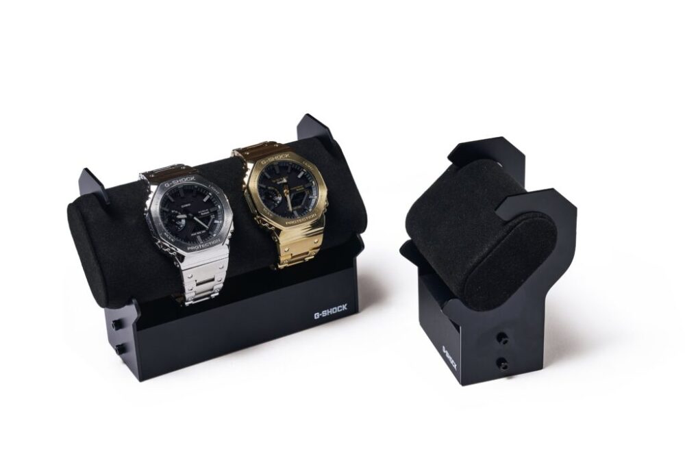 G-SCHOCKが作ったウォッチマウント。ベースはスチールでレストはポリウレタンとナイロン製で構成されている。重厚感があるので、腕時計をしっかり固定してくれる。1本用3850円、2本用5335円(カシオ計算機 お客様相談室 TEL0120-088925 https://www.casio.com)